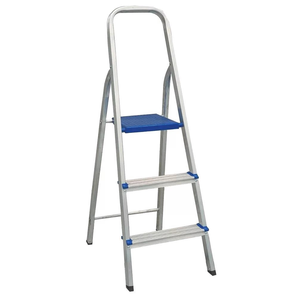 Escada de alumínio de liga especial, super resistente com degraus e sapatas antiderrapantes. Trava de segurança em alumínio com articulação lateral e sistema de sustentação traseira em x.