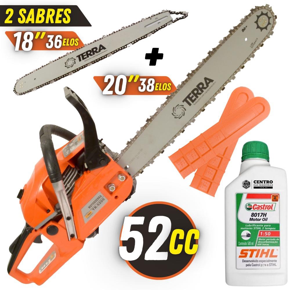 Motosserra Profissional Terra MT520 à Gasolina 2T 2,5HP 52cc Com Sabres de 18'' e 20'' + Óleo Castrol Stihl 500ml