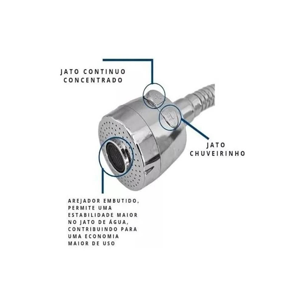 Torneira bica móvel 360 (giratória) de cozinha para instalação na parede, modelo gourmet, fabricada em metal cromado. Possui arejador com regulagem de jato sendo 02 (dois) jatos opcionais que podem ser selecionados de acordo com a sua necessidade, chuveirinho tipo spray ou jato fechado convencional, gerando mais flexibilidade de uso. Sua bica flexível gourmet oferece flexibilidade de uso, podendo ajustá-la para o local mais adequado sem perder a rigidez do posicionamento, gerando melhor conforto e facilidade de uso para o dia-a-dia. Sua bica fabricada em metal inoxidável permite longa vida em seu acabamento, proporcionando eficiência em sua estética durante longo tempo. O produto conta também com filtro completo, incluindo o elemento filtrante (vela) em carvão ativado aprovado pelo inmetro, absorvendo o máximo de impurezas, podendo ser utilizada para o consumo humano. Além disso, conta com mecanismo de abertura e fechamento 1/4 de volta, gerando mais economia e conforto ao manusear, com maciés e rapidez, trazendo mais economia de tempo e água.
