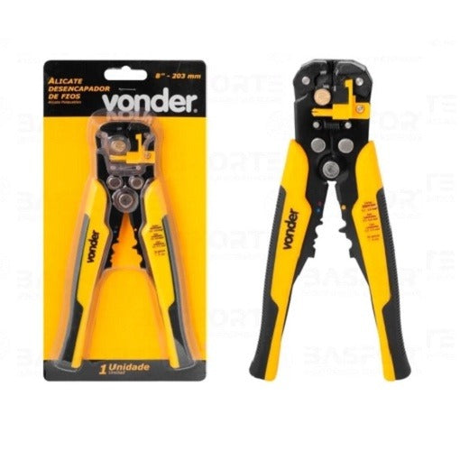 - 01 Alicate Desencapador de Fios Automático e Crimpador. Possui Multifunção, Corta, Desencapa e Crimpa Terminas. Remove o isolamento, sem danificar o núcleo interior, possui ajuste adicional de decapagem comprimento e função dos terminais a prensar. Corta e desencapa cabos e fios de cobre e alumínio com bitolas de 0,5 a 6,0mm² (awg 24-10). Crimpa terminais isolados e terminais não isolados de 0,5 a 6,0mm² (awg 22-10). Crimpa terminais de ignição de 7mm a 8mm.