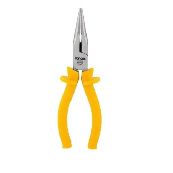 -01 Alicate de Bico Meia Cana 6" Isolação 1000V ( De acordo com Recomendação da NR-10). Indicado para o manuseio de terminais em locais de difícil acesso em instalações elétricas e corte de fios e arames macios. Possui cabo isolado anatômico e antiderrapante, com abas de proteção, que oferece maior conforto e segurança ao operador. Marca Vonder.