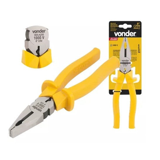 -01 Alicate Universal Eletricista 8", Isolação 1000V ( De acordo com Recomendação da NR-10). Produzido em Aço Cromo Vanádio, proporcionando maior resistência e durabilidade. Possui cabo isolado anatômico e antiderrapante, com abas de proteção, que oferece maior conforto e segurança ao operador e Dispositivo para prensar terminais de diversas medidas até 6mm. Marca Vonder.