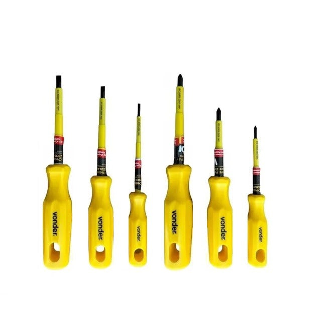 -01 Conjunto de 06 Chaves de Fenda e Phillips uso Profissional com Haste Isolada 1000V de Marca Vonder. Cabo e haste isolados 1000V de acordo com a norma nbr 9699 e recomendação da NR-10. Vem com Cabo ergonômico que proporciona menos esforço e muito mais torque e com design exclusivo. Todas as chaves são produzidas em Aço Cromo – Vanádio com Haste temperada em toda a sua extensão. Possuem a Ponta Oxidada e Imantada, facilitando o trabalho do dia a dia.